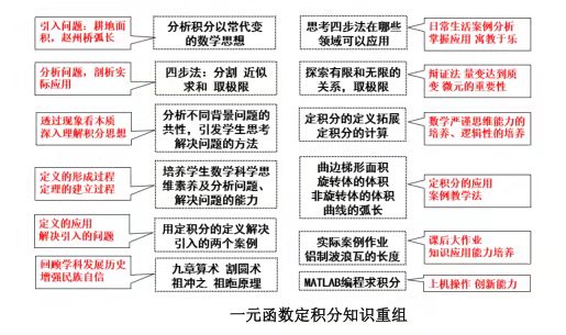 在教学内容组织上,武文佳老师及其教学团队也是用尽了心思。他们采用了“共同构建法”,基本思想在于根据极限、微分、积分、微积分应用等知识模块,在知识的讲解过程中,主动设计与知识点相贴合的应用案例。其中“构建”并不是客观的描述一件事情,而是主动设计,在设计中融入数学的思想和教师的理念,并使用客观的原理展现合乎逻辑的知识体系。因此在内容重组中,对每个知识模块设计一个“故事”,将整个一元函数微积分及多元函数微积分的课堂设计为一个“系列”大片,并融入人文素养和课程思政,并且设计实践性训练内容,全面培养学生各方面能力,提高学生学习兴趣及学习成效。以“一元函数定积分模块”内容重组为例: