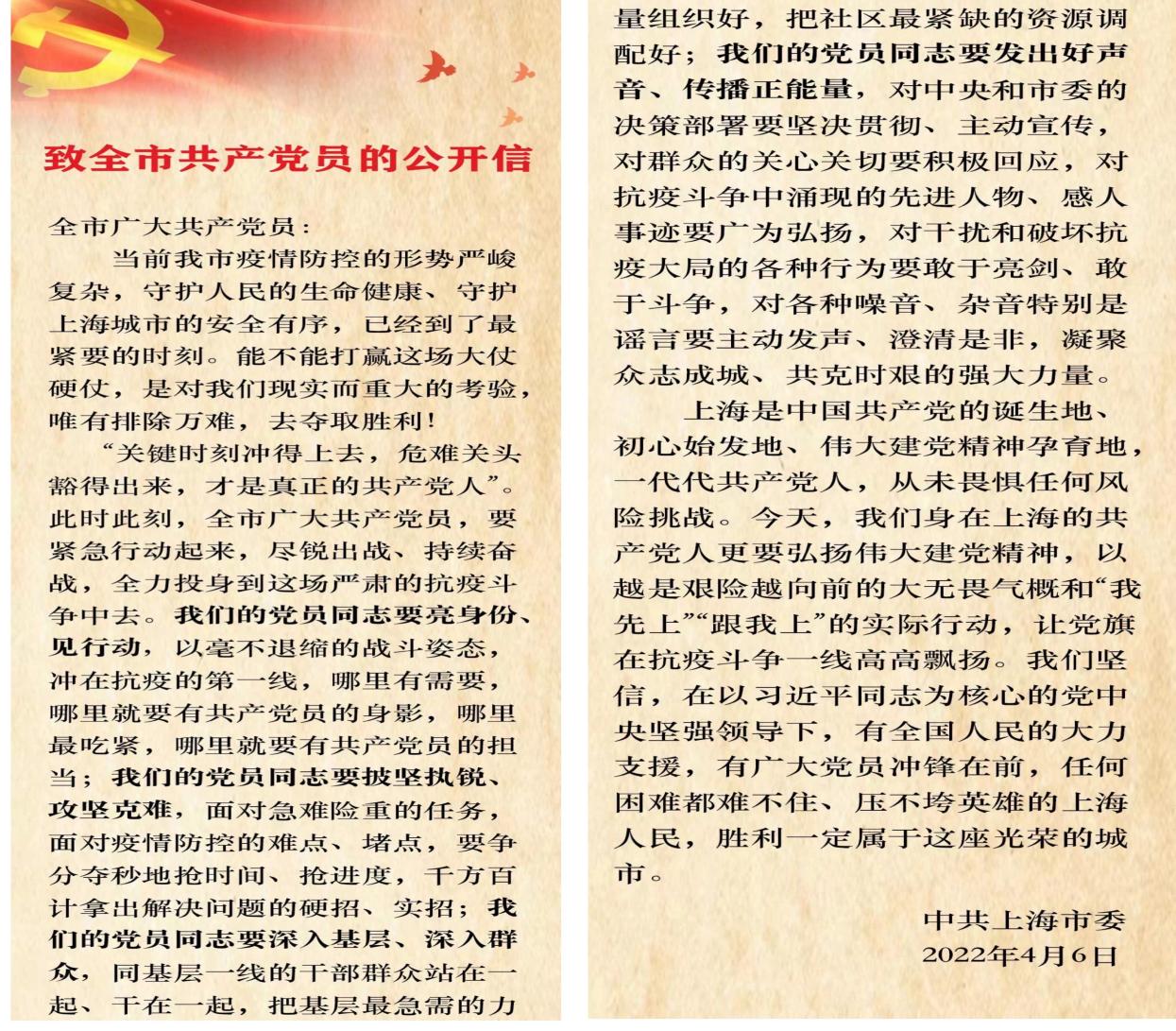 在疫情正吃紧的关键时刻,如今党员们收到上海市委致全市共产党员的公开信。结合学校疫情防控工作实际,康秀珠号召全体党员教师充分发挥党员的先锋模范带头作用,扛起特殊责任,拿出特殊担当,号召校外党员同志主动下沉社区抗疫一线,接受居村党组织统一指挥,与基层干部群众并肩作战,当先锋,做表率;学院专班教师要继续提高战斗意识,保证学院线上线下工作的正常运行;校内专班党员教师继续发扬先锋模范作用和奉献精神,继续参与学生园区网格化管理,深入学生园区加强学生园区网格化管理力量,真正把学校各项防控措施落细落实,共同筑牢学校疫情防护的“铁壁铜墙”。
