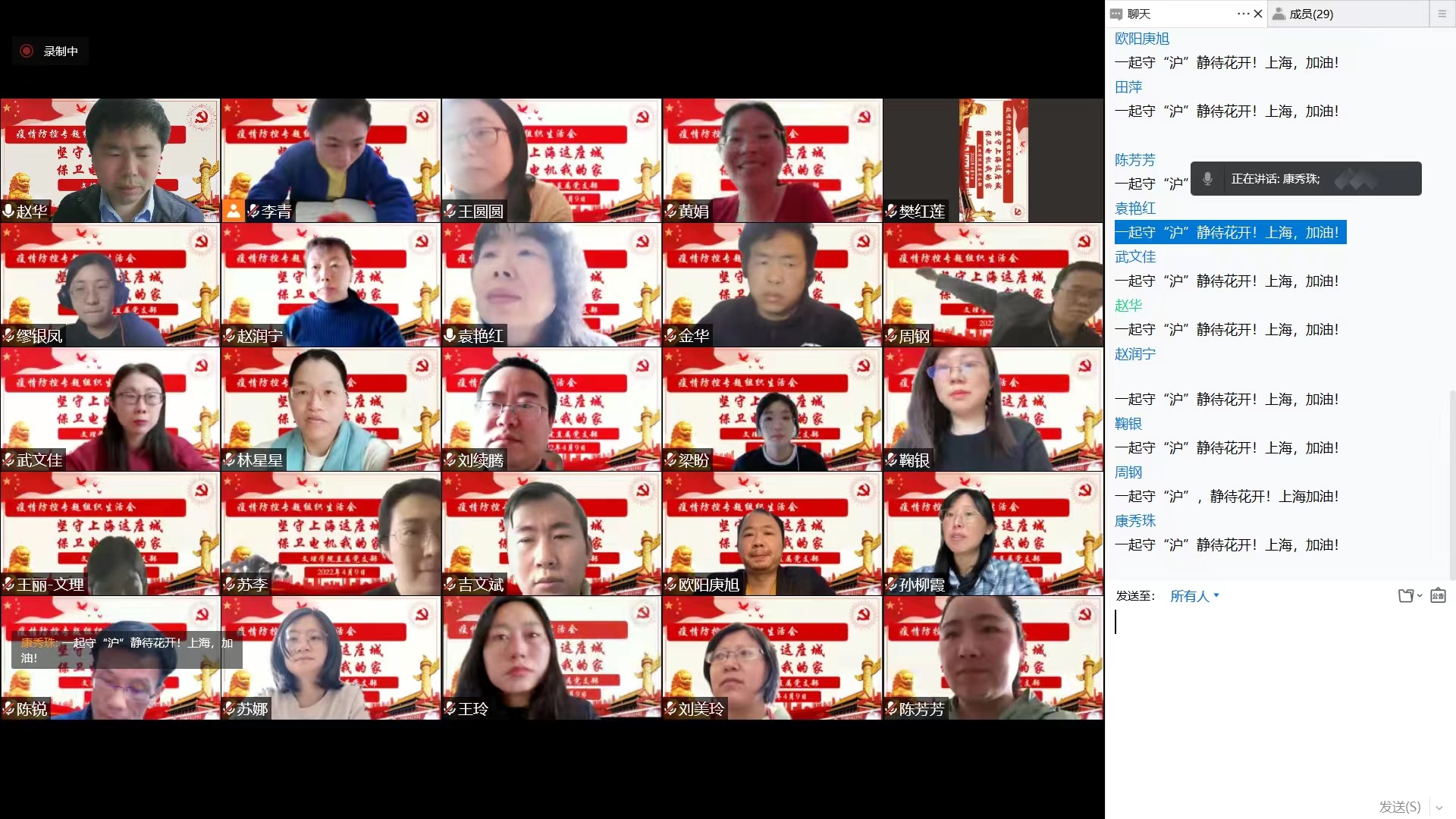 随后,康秀珠对学院支部党员老师们的日常生活与工作情况进行了排摸,并重点对情况特殊的党员教师表示了关心和问候。党员老师也都纷纷敞开心扉,彼此进行了交流,互相表达了关心与想念。党员教师们认真落实“双报到”通知要求,在做好线上教学的同时,积极参加社区抗疫志愿活动。大家纷纷交流了自己做志愿者时的感受。有的党员家中上有年迈的老人,下有还在咿呀学语的儿女,在社区防护措施不足,阳性病例持续增长的情况下,仍然坚守志愿者岗位;有的党员起早贪黑,不辞辛苦地坚持给社区每家每户送物资;有的党员在自己腰伤还没有痊愈的情况下,坚持参与社区货物的搬运与发放;校内专班的党员教师也始终坚守学校抗疫一线,守土担责、守土尽责,24小时随时待命,行动如闪电,运转如机器。
