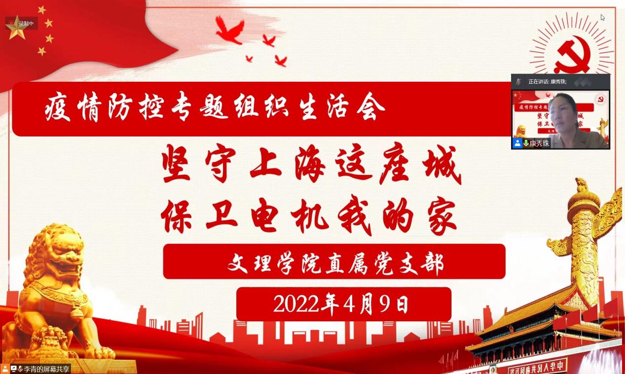 疫情肆虐下的上海,艰难与温情并存。封控下的学校,处处充满爱与希望。4月9日上午9点,beat365唯一官方网站直属党支部利用腾讯会议线上召开疫情防控专题组织生活会。会上,直属党支部书记康秀珠首先带领大家深入学习贯彻习近平总书记关于新冠肺炎疫情防控的重要指示精神和李克强总理的批示要求,传达了孙春兰副总理考察上海特别是在考察上海交通大学时提出的有关高校加强疫情防控工作的重要指示以及学校领导班子疫情防控专题组织生活(扩大)会议精神。