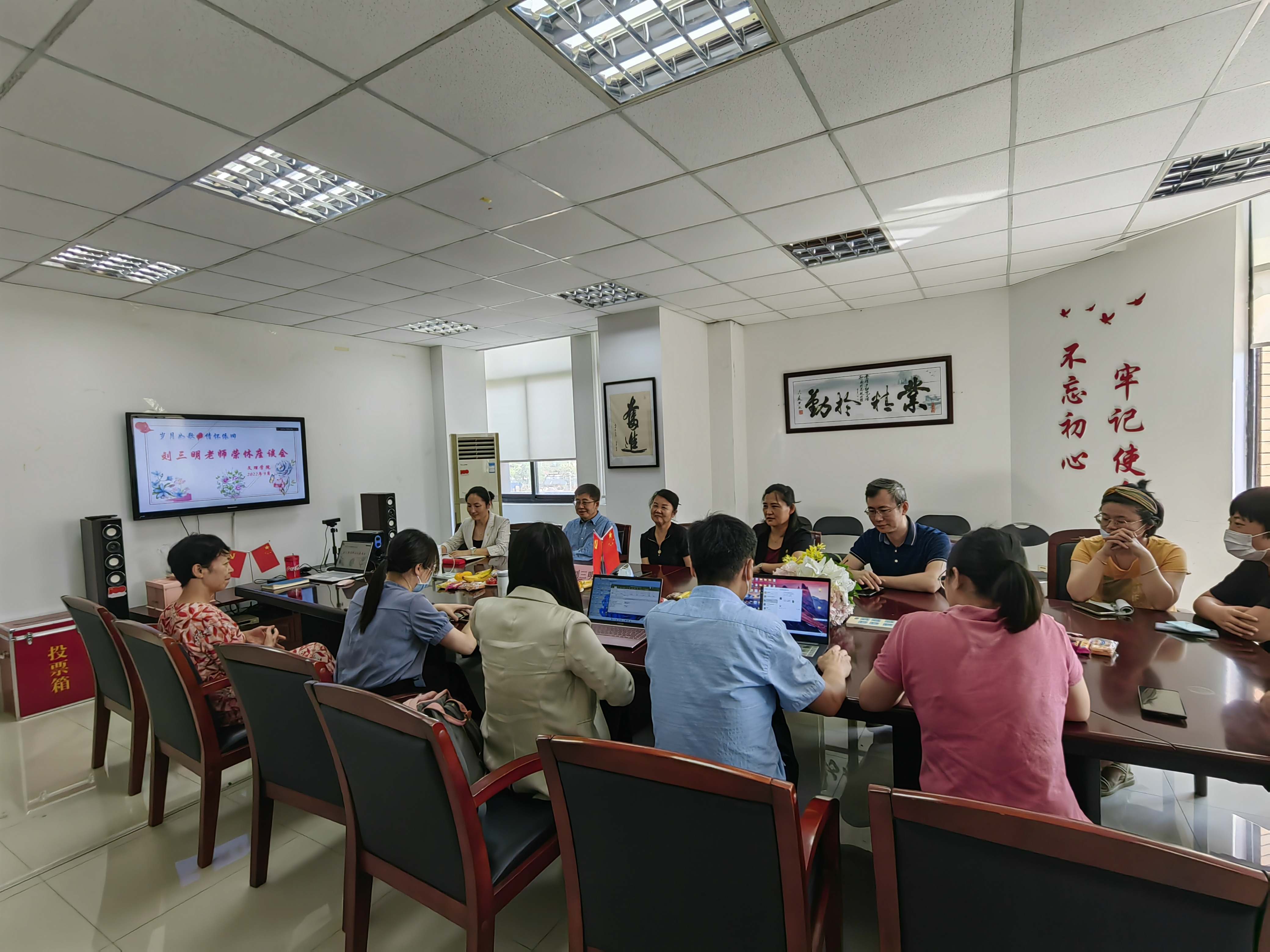 9月9日下午,beat365唯一官方网站在文理楼313会议室为刘三明老师举办了荣休座谈会。直属党支部书记康秀珠主持会议,学院领导班子、直属党支部委员、分工会委员、教研室教师以及团队成员参加了座谈会。