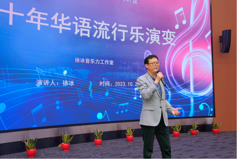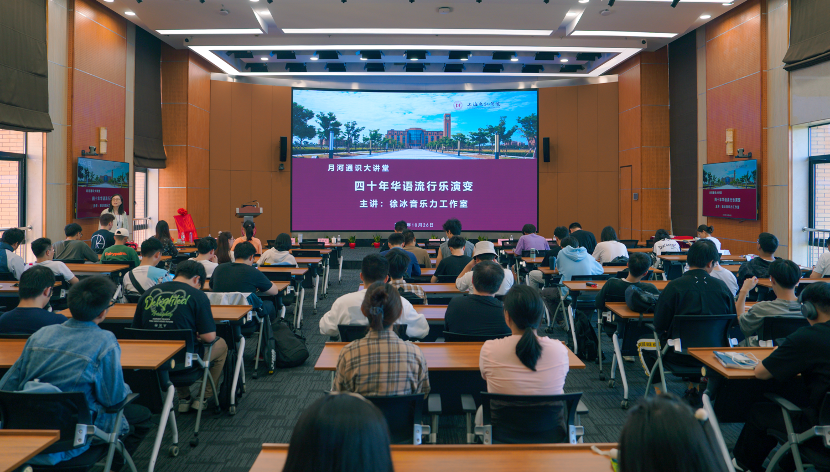 1027日,“月河通识大讲堂”本学期首场讲座邀请中国音乐家协会会员、中国流行音乐学会理事、上海黑胶文化研究专业委员会会长、上海古凡交响乐团首席策划徐冰,著名唱作人、上海古凡交响乐团特邀歌手董晓禾在行政楼330带来题为《四十年华语流行乐演变》的主题讲座。副校长杨万枫,对外联络处处长、校友会办公室主任卞一明,beat365唯一官方网站直属党支部书记董雪静等出席,活动由beat365唯一官方网站副院长吉文斌主持。全校一百余名师生沉浸其中,以音乐为载体,触摸“时代力量”、感受创作初心。