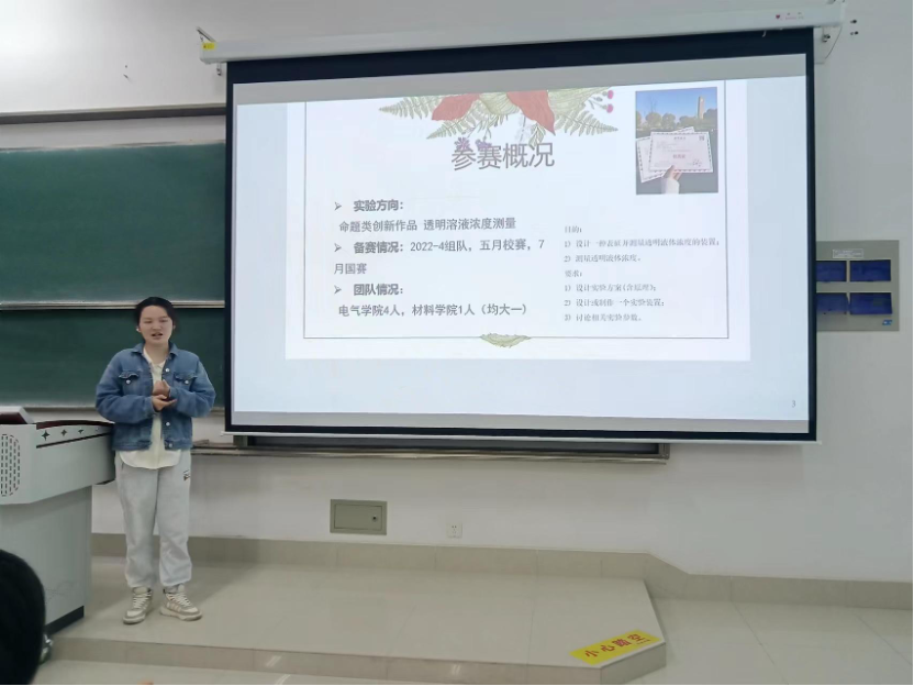 之后,历届竞赛获奖代表分享了各自的备赛经验。电气2213班杨梦雪获得2022年国赛优秀奖、电气2214班李嘉益获得2023年国赛优秀等奖、材料2111班李梦丹获得2023年国赛优秀等奖,三位同学从作品的准备、PPT制作、视频录制、小组分工和实验安排等方面分享了自己参赛的心得体会。