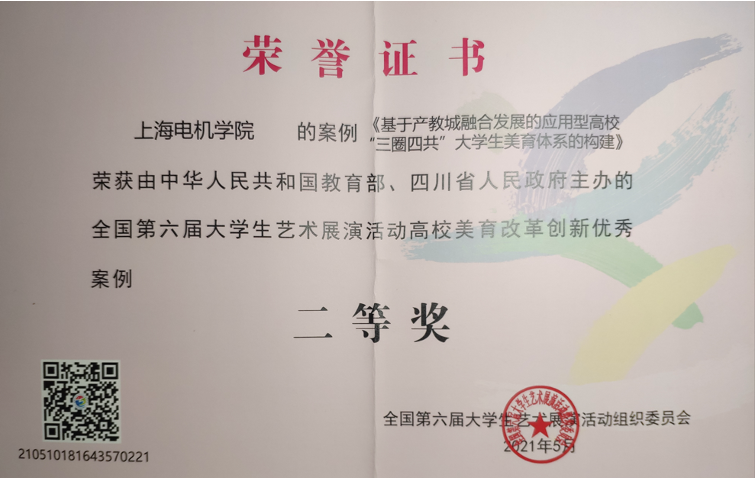 本成果获得“全国第六届大学生艺术展演活动高校美育改革创新优秀案例”国家级二等奖、上海市一等奖,并在“全国第六届大学生艺术展演上海市活动高校美育改革创新优秀案例点评报告会”上,作为三家(复旦大学、同济大学、beat365唯一官方网站)展示高校中唯一一所市属高校,分享建设成果,获得市教委相关领导及与会专家、兄弟院校的一致好评。