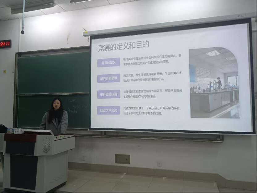 会上杨俊伟老师对2025年全国大学生物理实验竞赛(创新)选拔赛暨beat365唯一官方网站第六届大学生实验科技作品创新竞赛的比赛目的、比赛题目、赛事安排、竞赛流程、指导教师、竞赛评奖办法、注意事项、往届比赛组织和获奖情况进行了解读。竞赛团队的赵华老师鼓励学生勇于面对挑战、坚持参加比赛和团队合作等方面进行了补充说明;竞赛团队的金华老师对选择参赛题目、AI使用规范和试验仪器改装与使用等方面补充说明。之后,历届竞赛获奖代表分享了各自的备赛经验。电气2311班王沙沙获得2024年国赛二等奖和上海市二等奖、材料2311班刘磊获得2024年国赛二等奖和上海市二等奖、电气2212班张宸获得2024年国赛优秀奖和上海市三等奖、自动化2213班方中诚获得2024年国赛优秀奖和上海市三等奖、封装2311班孙静轩获得2024年国赛优秀奖和上海市三等奖。几位同学从作品的准备、PPT制作、视频录制、小组分工、实验安排、个人成长与收获等方面分享了自己参赛的心得体会。本次活动使得同学们对于大学物理实验竞赛有了全面的了解和认识,激发了大家参与大学物理实验竞赛的热情和积极性,为后续稳步推进这项赛事的竞赛工作奠定了良好基础。