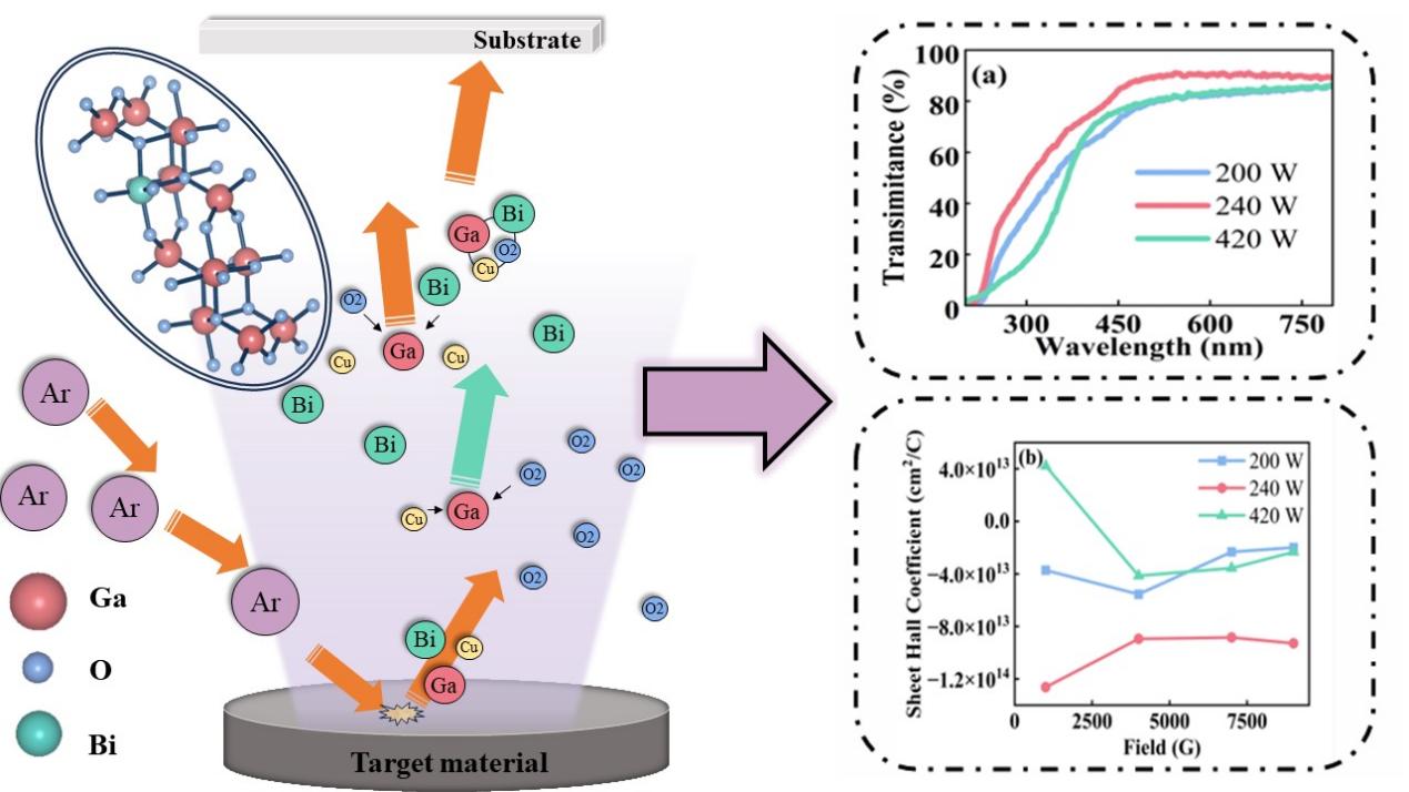 作为超宽禁带半导体代表,β-Ga2O3凭借其优异的耐高压、抗辐射特性及高紫外响应灵敏度,在电力电子与深紫外探测领域展现出巨大应用潜力。然而,受限于材料本征缺陷,其p型掺杂效率长期难以突破,成为制约器件性能提升的关键瓶颈。针对这一挑战,研究团队创新性地采用磁控溅射技术,在蓝宝石衬底上制备了铋(Bi)、铜(Cu)共掺杂β-Ga2O3薄膜,并系统探究了溅射功率与退火工艺对材料性能的影响。通过多尺度表征技术,揭示了双受主掺杂的协同作用机制:Bi的引入通过形成Bi2O3合金相显著提升材料价带顶位置,结合Cu掺杂对缺陷态的调控,成功调控薄膜光学带隙。尤为关键的是,通过霍尔效应首次发现氧化稼的弱p型导电特性,该成果不仅验证了双受主掺杂对材料能带结构的有效调控能力,更标志着p型β-Ga2O3掺杂研究迈出实质性一步。
