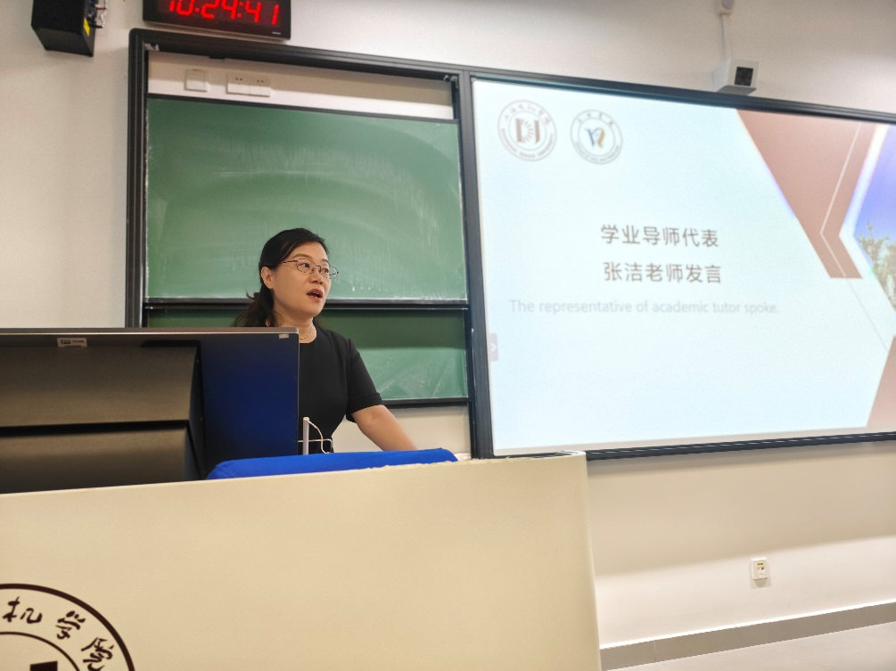 导师代表张洁老师随后发言。 她结合个人以往教学与科研经历,从学习与生活两方面对新生们提出了中肯建议,并承诺将全力指导学生夯实专业基础,积极投身学习和专业活动,在实践中锻炼能力、提升自我。