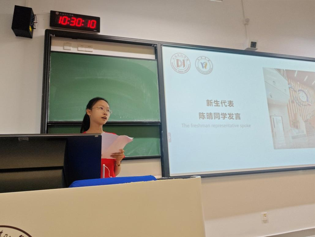 新生代表物理2512班陈晴同学在发言中表达了进入大学的欣喜与憧憬。她以“明德至善,博学笃行”的校训与全体新生共勉,展现了2025级新生昂扬向上的精神风貌和奋发学习的坚定决心。